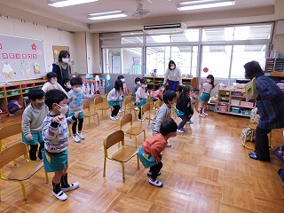 3歳は『ぺんぎんたいそう』の絵本も読んでもらい、一緒に体操をして遊びました。体を伸ばしたり、ジャンプしたり・・・いろいろな動きに子どもたちも、ぺんぎんになった気持ちで楽しんでいました。