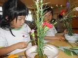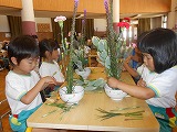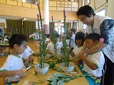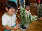 今日は、初めてのお花の教室。「このお花、知ってる」「これくらいがいいかな?」「次は、このお花」「どこにいれようかな?」と、色とりどりのお花を手にし、それぞれの思いでお花を生けました。