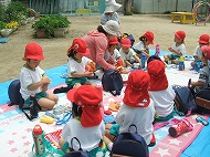 お母さんお手製のお弁当をいただき、「おいしいな~」と、みんなにっこり・・・。暑い一日でしたが、元気一杯歩きました。幼稚園の周りは、まだまだ楽しいことがいっぱいありそうです。