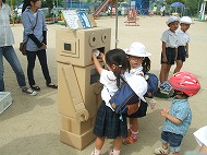 PTA活動「親子でエコ活動をはじめましょう!」とPTA活動としてのエコキャップリサイクル活動。2年前から受け継がれているエコロボットくんにキャップを食べさせることが子どもたちにも大人気。子どもと一緒にエコ活動をしています。
