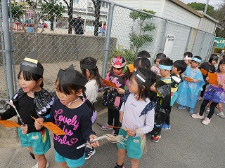 マントやステッキなど自分で考え、工夫して作ったものを身に着けてにこにこの子どもたち。