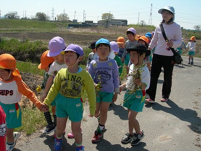 園庭のチューリップの花がきれいに咲いています。新しいお友達を迎えて、平成26年度がスタートしました。3歳児の子供たちも日に日に新しい環境に慣れてきています。4・5歳児の子供たちは早速散歩に出かけ,春をたくさん見つけました。
