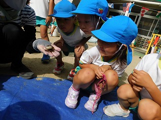「きゃー、こわいよ~」「だけど、見せて!」と近くで観察する5歳児のお友達。