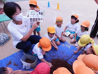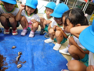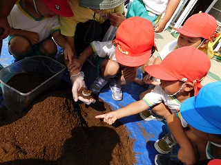 ウンチを取り除いたり、土が乾かないように霧吹きをしたりして、お世話をすることが大切と分かった子どもたち。
