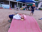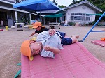 坂道になっているマットは、意外と転がるのが難しいですが、「よいしょ。よいしょ。」と上手に体を使って転がる子どもたち。