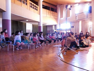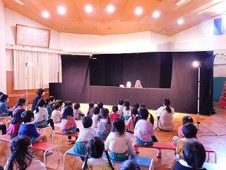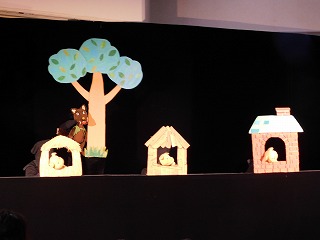 人形劇ユニットぷくぷくさんをお招きして、人形劇の始まりです。お話『3匹のこぶた』では、こぶたたちのコミカルな動きやオオカミのダイナミックな動きに子どもたちも先生たちも釘付けになりました。
