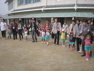 園庭で遊ぶ様子を観て頂いたり、一緒に“マル・マル・モリ・モリ”の体操や“マイムマイム”のフォークダンスをしました。