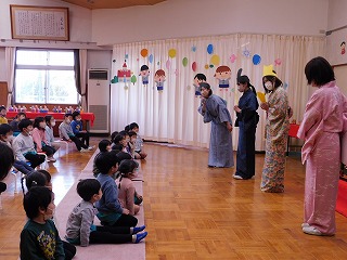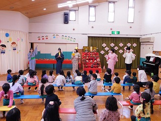 そして・・・先生たちもひな人形に変身!!ひなまつりにまつわるクイズをしたり、みんなで♪うれしいひなまつりを歌ったりしました。「ひなまつりには、何のお花を飾るでしょうか?」「雛人形は何をしているところを表しているでしょうか?」などのクイズに全問正解のお友達もいました。