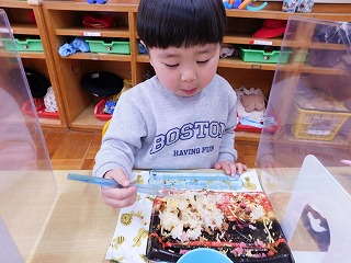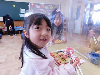 そして、お昼には、ちらしずしやひし餅型のゼリー、ひなあられをいただきました。「おいしい♡」と大好評。ひなまつりならではの経験ができた1日となりました。草内幼稚園の子どもたちが、これからも元気に健康で過ごせますように・・・。