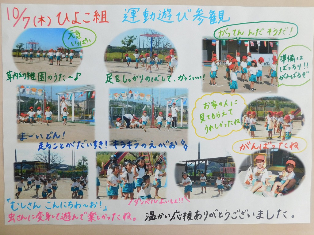 初めての運動遊び参観。お家の方が見えると、手を振ったり、少しどきどきしている表情も見えたりした子どもたち。体操やかけっこ、「むしさん こんにちわ~お」では、一生懸命な表情や思い思いに体を動かして楽しむ姿が見られました。ごほうびにもらった金メダルも「わたしの!」「ぼくの!」とすごく嬉しそうでした。
