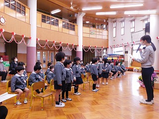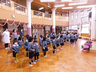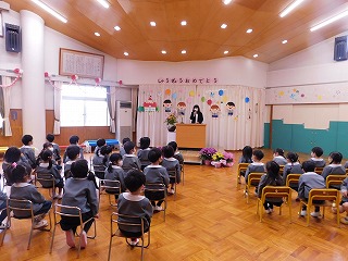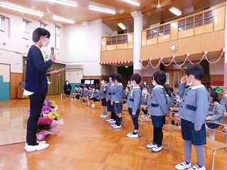 24日(金)に3学期の終業式を迎えました。ホールに全員が集い、一人ずつ名前を呼んでもらったり、1年間の遊びや生活を振り返りました。