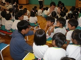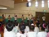 アンサンブルチーム GUさんが、素敵なハーモニーをホールいっぱいに響かせてくださいました。子ども達のよく知っている “アンパンマンマーチ”や“となりのトトロ”を聞かせていただき、手遊びをやジャンケン遊びを楽しみました。最後に“虹”の歌一緒に大合唱しました。手話をつけた“風になりたい”のとってもきれいな歌声に、子ども達も先生達も感激しました。