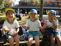 大学生もやさしく話しかけてくれました。秋空の下のおにぎりはおいしいね。