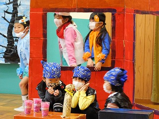 そして最後は、靴を作ってくれた小人さんへのお礼にごちそうを作りたいという子どもたちのアイディアからりす組オリジナルのお話が生まれ、一人一人の思いの詰まった劇遊びになりました。
