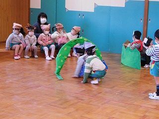 「歳をとった動物たちはどんな風に歩くかな?」などとみんなで考え、意見を出し合って遊んできました。どろぼうたちがうたう歌の振りにも、子どもたちの考えるどろぼうらしさが詰まっています。そして最後の動物たちが泥棒を驚かす場面では、どんな風にしたいかみんなで相談して進めてきました。皆で力を合わせることの面白さや大切さを遊びの中で感じる姿が沢山見られました。