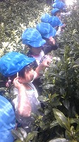 「どれをつむの?」「1・2・3やって」「やわらかいよ」「これがおちゃ?」「このはっぱ、おちゃのあじする?」 といいながら、一生懸命摘みました。