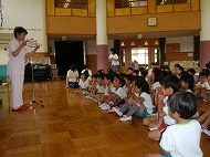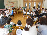 4,5歳児は、噛むことの大切さを教えていただいたり、実際にどのように歯磨きをするか教えていただきました。「これから30回モグモグするねん」とはりきる子どもたちでした。