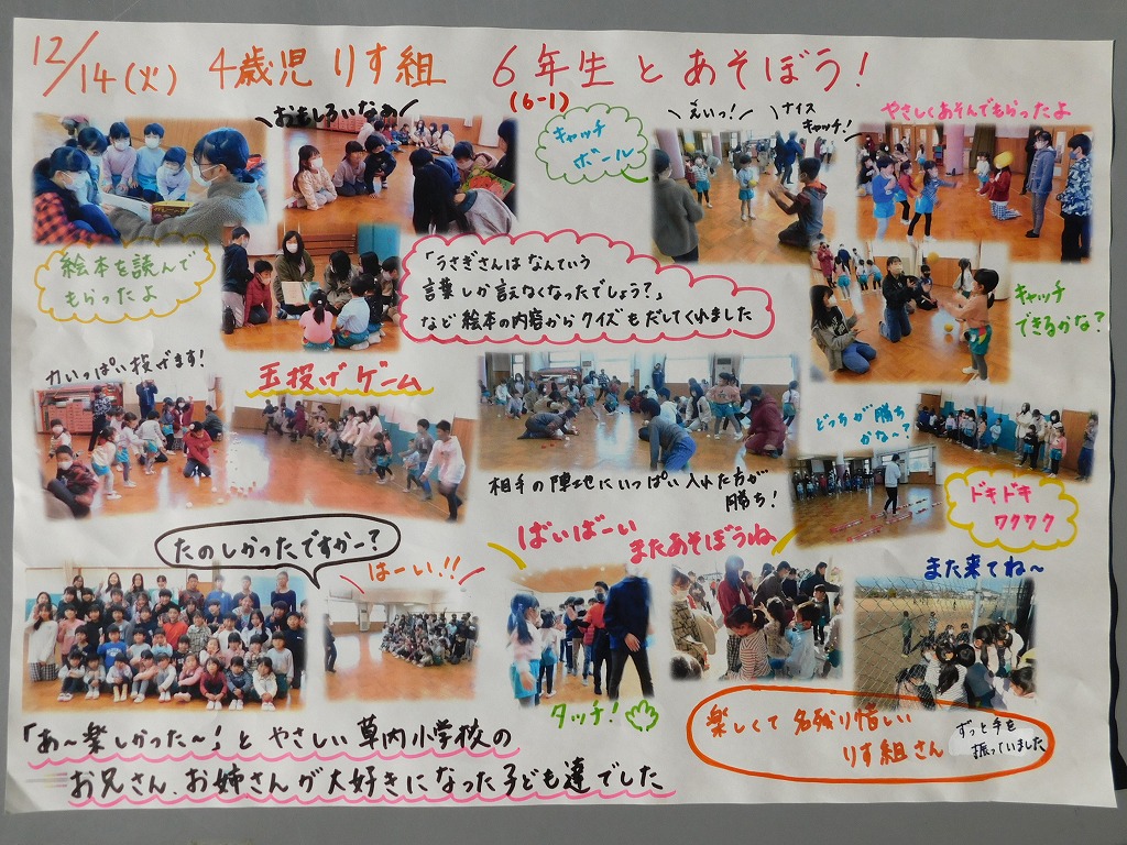 4歳児、5歳児の子ども達が草内小学校6年生のお兄さん、お姉さんとの交流を行いました。