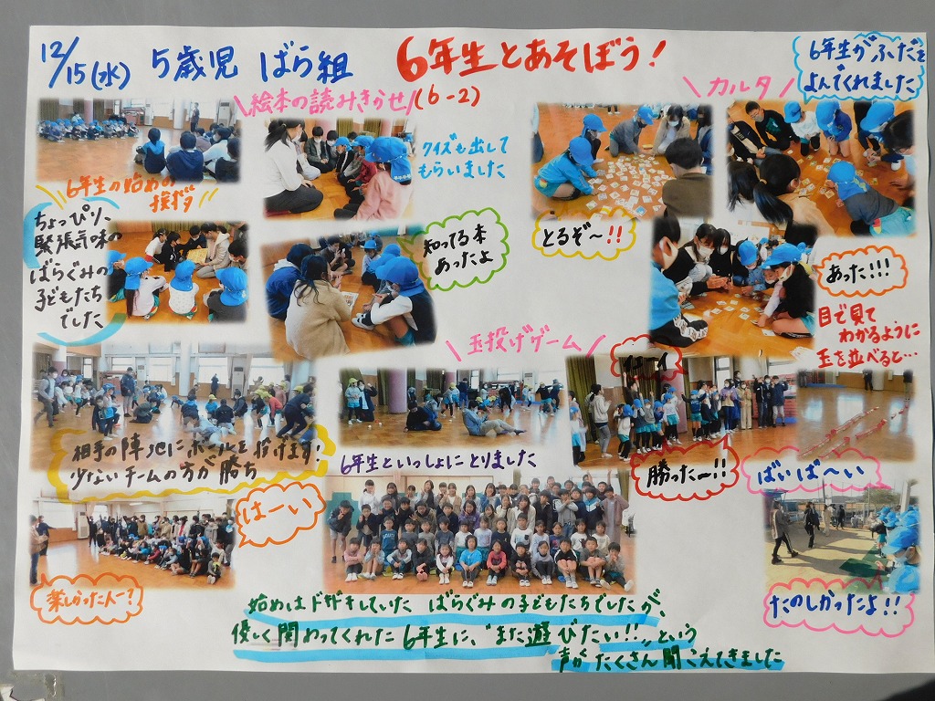 5歳児ばら組の子ども達はカルタをして一緒に遊びました。6年生のお兄さん、お姉さんに読み札を読んでもらい、「いっぱい取るぞ~」と真剣な子ども達。お兄さん、お姉さんの読む声をよく聞こうとする姿が見られました。