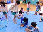 「よし足で踏んで伸ばそう!」と一人一人土粘土の上で足踏みをしたり、跳んだりして少しずつ柔らかくなっていく土粘土の感触を楽しんでいました。
