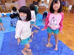 始めは手だけで触っていた子どもたちですが、次は「足で踏んでみよう!」と踏んでみたり、「体にぬったらおもしろーい!」と友達と腕や足に土粘土をぬり合いっこ。