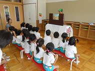 「ゴーヤマンの登場です」        環境の紙芝居を真剣に見ています