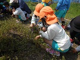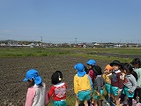 今日はとても良いお天気!。4・5歳児の子どもたちが手をつないで幼稚園の廻りを散歩に行きました。「やっほー!」と、遠くまでみんなで声を合わせたり、菜の花がいっぱいの畑に大歓声!!・・・