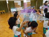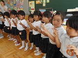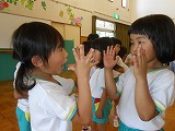 翌日、早速4・5歳児の子どもたちが、3歳児の子どもたちにわらべうたを伝える姿が見られました。
