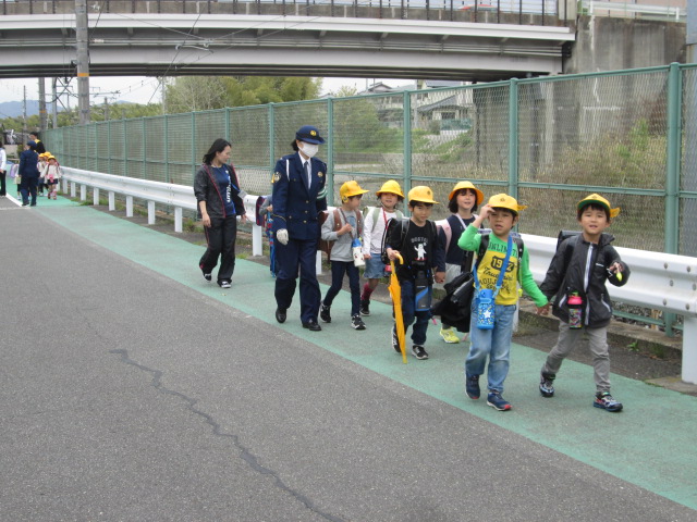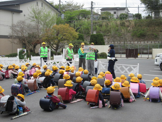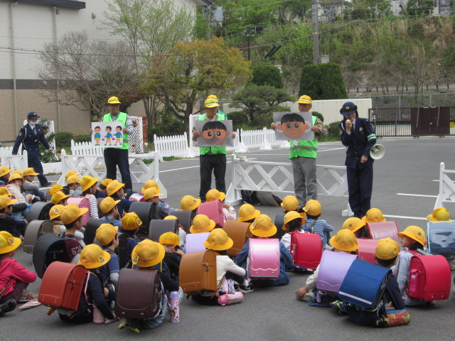 下校する前に田辺警察の方から道を歩くときに気をつけること、例えば、右側通行や曲がり角では一度止まって左右を確認すること、耳もすまして音もよく聞くことなどです。安全に登下校できるように、絵などを用いて子どもたちへわかりやすく説明してもらいました。