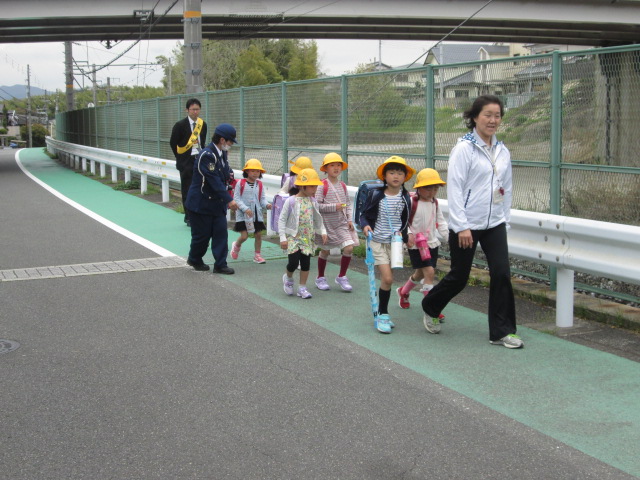 次は、話を聞いたことを実践できるかチェック。警察の方にもついてきていただき、実際の登下校ではどのように歩けばよいか、教えてもらいながら下校しました。