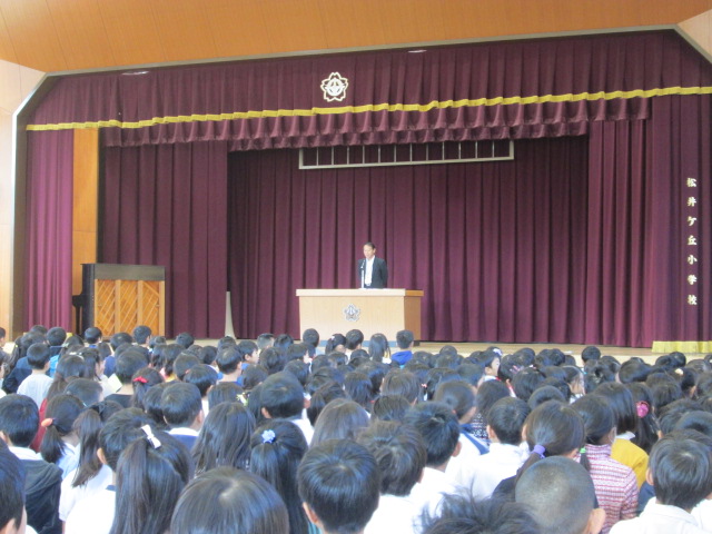 次に、校長先生から、「当たり前のことを当たり前にする」ことについてお話がありました。安全帽をかぶる、グリーンベルト内を安全に登校する、目と目を合わせてあいさつをする等、日頃言われていることを、当たり前にできるようにしましょうと話されました。
