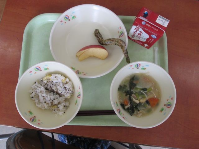 今日の献立は、栗ご飯・ししゃものわかくさ揚げ、みそ汁、りんご、牛乳です。