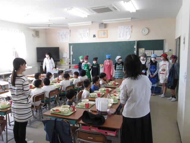 配膳は5年生がお手伝い。お兄さん・お姉さんが給食を置いてくれると園児からは「ありがとう」。とても微笑ましい光景でした。