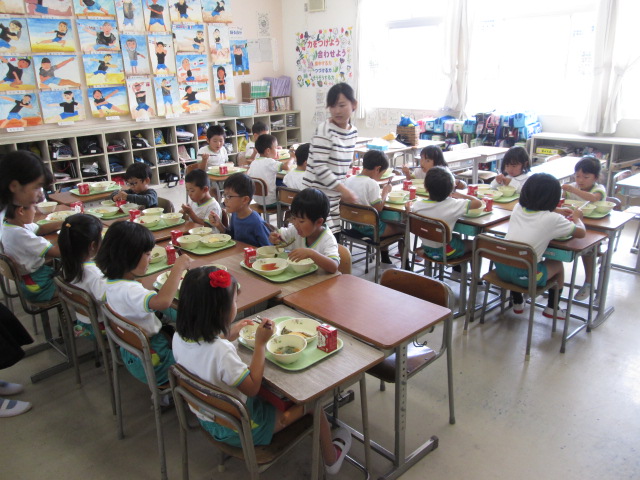 校外学習で学校を出ている4年生の教室を借りて、18名の園児が小学校の給食を食べました。