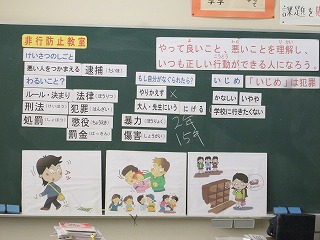 授業の中で、自分たちの身近な出来事で、実際には法律に反している場合があることや、法律に違反すると処罰があることを学びました。また、『「いじめ」は犯罪』であることを改めて確認することができました。