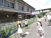 1年生が生活科の学習でシャボン玉遊びを行いました。身近にある様々な道具を工夫して使い、学級ごとにシャボン玉遊びを楽しみました。この日はとても良い天気で、夏の青空に浮かぶ大小様々なシャボン玉を、1年生の子ども達が見上げていました。