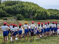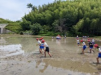 始め、子どもたちは、たっぷり水が入っている田んぼに入ることをためらっていましたが、いざ入ってみると「気持ちいい。」と言い、転ばないように気をつけながら歩いていました。