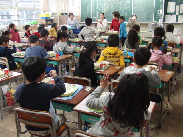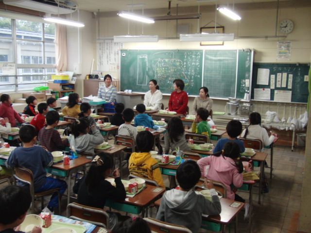 12月4~10日の5日間、給食調理員さんと子どもたちとの交流給食を行いました。普段、関わることの少ない給食調理員さんと交流することで、毎日食べている給食は、いろいろな人とのかかわりで作られていることを知り、感謝の気持ちをもつ取組です。
