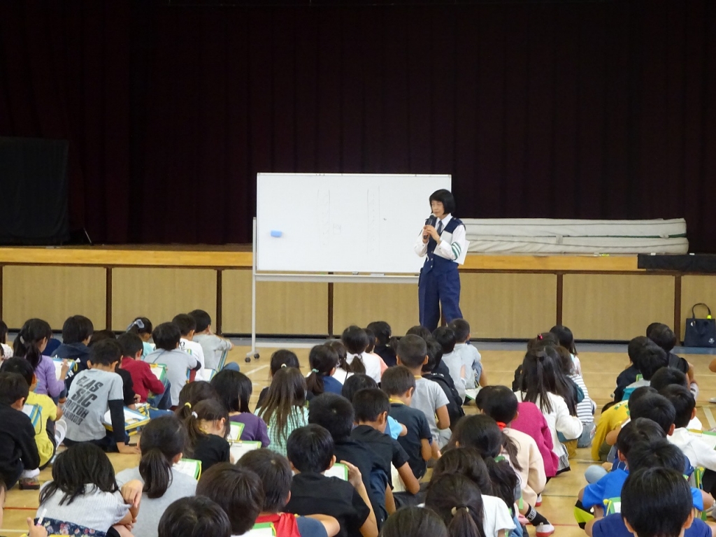 交通安全については、自転車の乗り方や路側帯のことについて教わりました。特に4年生は、先日の交通安全教室の経験も生かし、お話を聞くことができました。