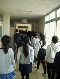 体育館で校長先生から話を聞いたり、中学生の案内のもとで校舎巡りをしました。
