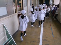 4月12日(水)この日から2年生から6年生の給食が始まりました。この日の献立は「牛乳、ごはん、和風ハンバーグ、ジャガイモの豆乳味噌汁」でした。給食当番の子ども達は先生の指示のもとエプロンをきちんと着て、配膳室へ給食を取りに行きました。今年度も安心、安全な給食を提供していきます。