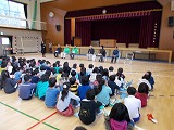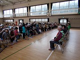はじめに、見守り隊の皆様へのあいさつと、名札わたし、合唱、鍵盤合奏のプレゼントをしました。