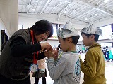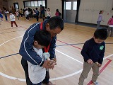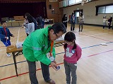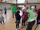諸注意の後、7つのグループに分かれていよいよ体験スタートです。けん玉、こままわし、あやとり、折り紙、だるま落としの遊びを、見守り隊の皆様に教わりました。