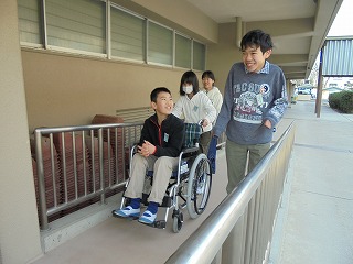 その後はグループごとに、「車いすに乗る人」「車いすを介助する人」「周りで見守り安全を確かめる人」に分かれて、校内に設定されたコースを巡りました。