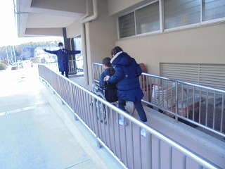段差の上り下り、スロープの上り下り、カーブの曲がり方など、ポイントとなるところでは、社会福祉協議会の方や、『ぴんぽ~ん』の方に声をかけていただき、安全に気をつけながら体験することができました。