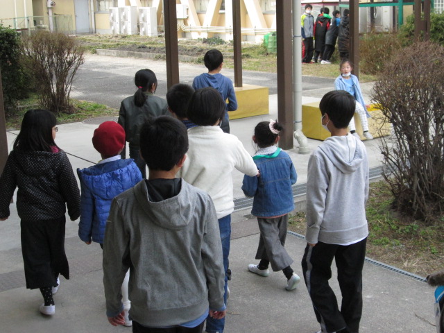 5年生のお兄さん・お姉さんに連れられて、校舎内を探検。4月から通う小学校の校舎を少しは知ることができたかな。