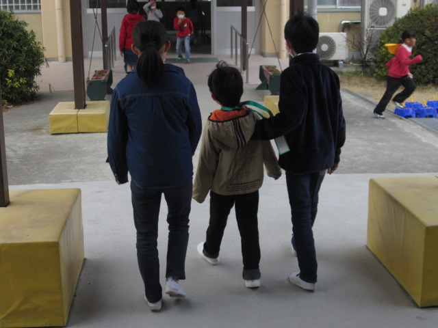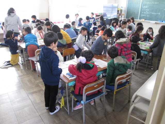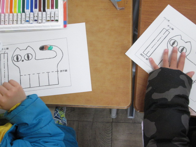 校舎探検の後は、1年生と一緒におもちゃ作り。色を塗ったり、紙を切ったり・・・1年生がやさしく教えてあげる姿が少し頼もしく見えました。