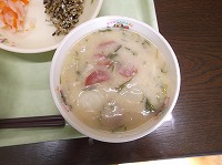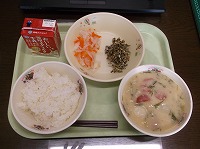 1月12日(木)この日から3学期の給食が始まりました。この日の献立は、「牛乳、ごはん、京風雑煮、紅白なます、ごまめ」というお正月メニューでした。特に京風雑煮は白みそに「にんじん、大根、白玉だんご」が入ったものが出されて、たいへんおいしくいただきました。3学期も安心・安全でおいしい給食を提供していきます。