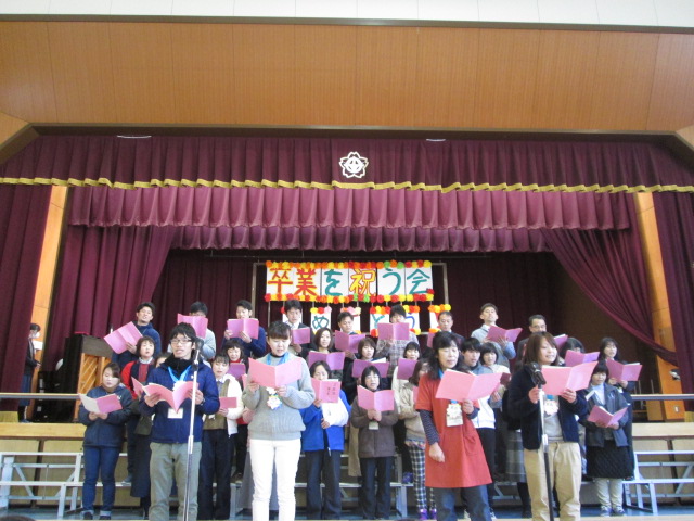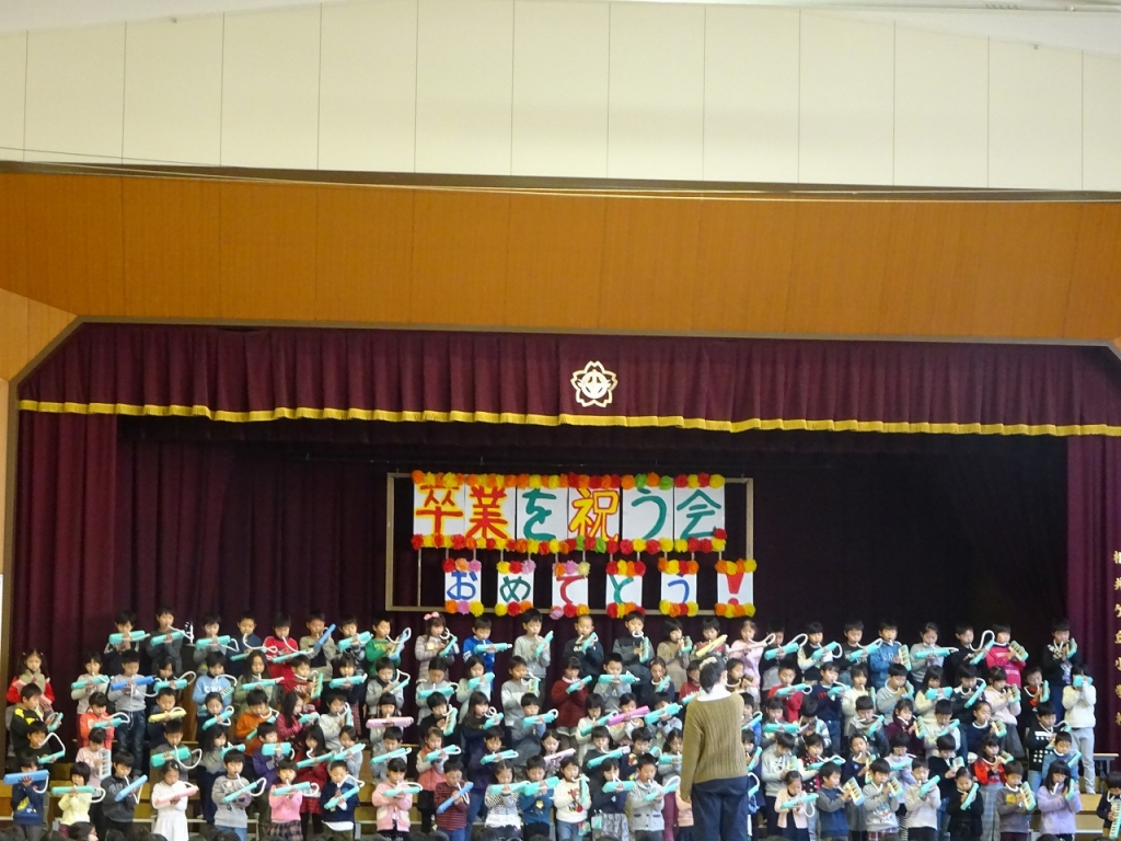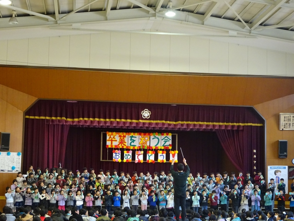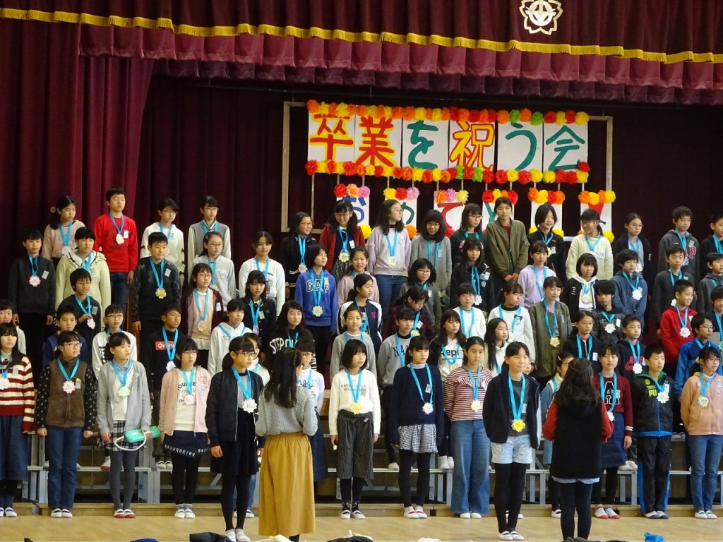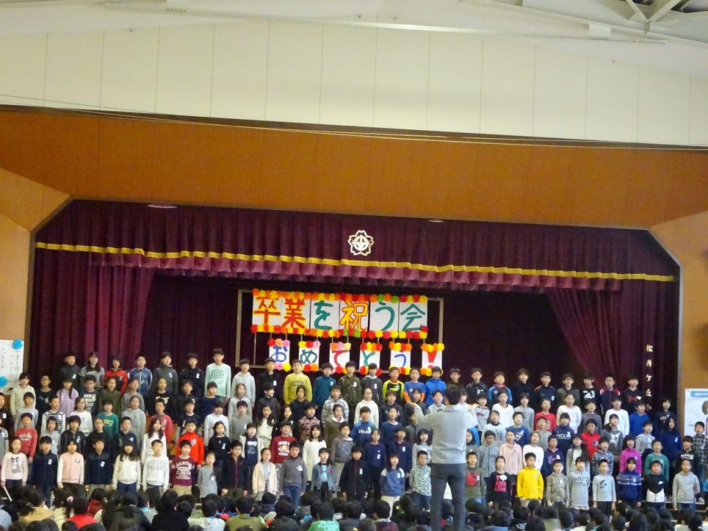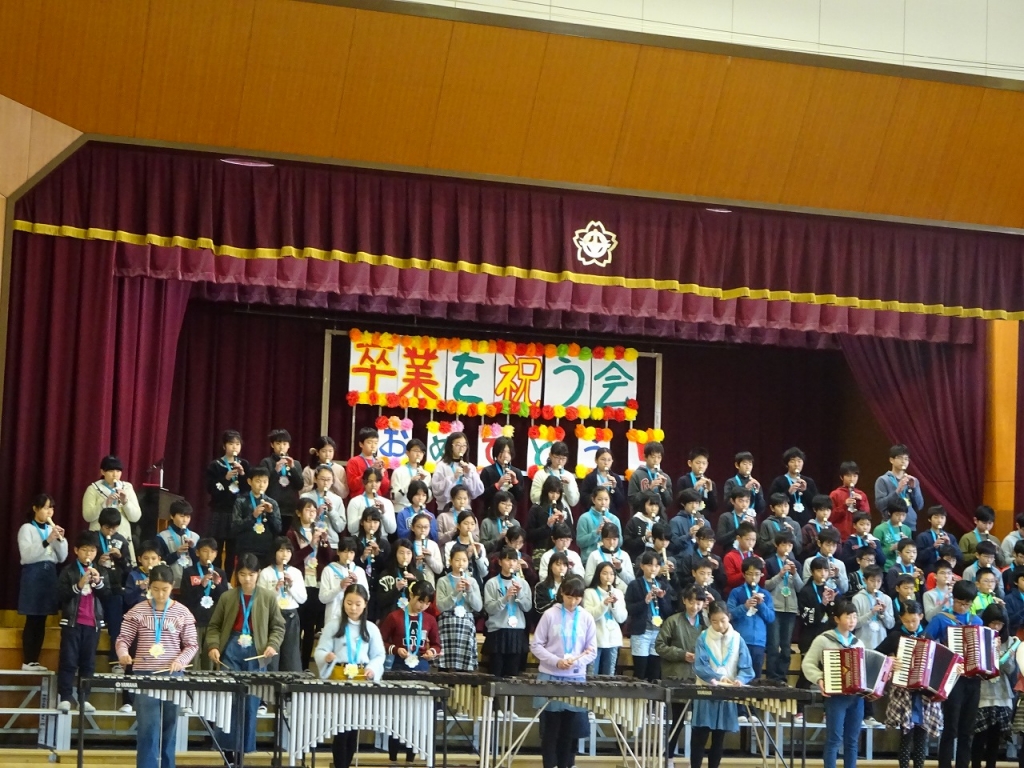 その後、1~5年生が6年生への感謝の気持ちを込めて歌や合唱のプレゼントをしました。