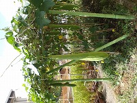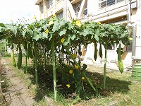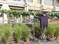 南校舎と体育館の間に畑があり、毎年様々な作物が育てられています。今年も、理科の学習で使用するへちまが大きく実りました。隣のプランターでは、5年生が植えた稲が、用務員さんお手製の案山子に見守られて、青々とした緑から黄金色に稲穂の色が変わってきました。実際に育てたり、収穫したりする活動を通して、子ども達の理解や気づきが深まる学習にしていきたいです。